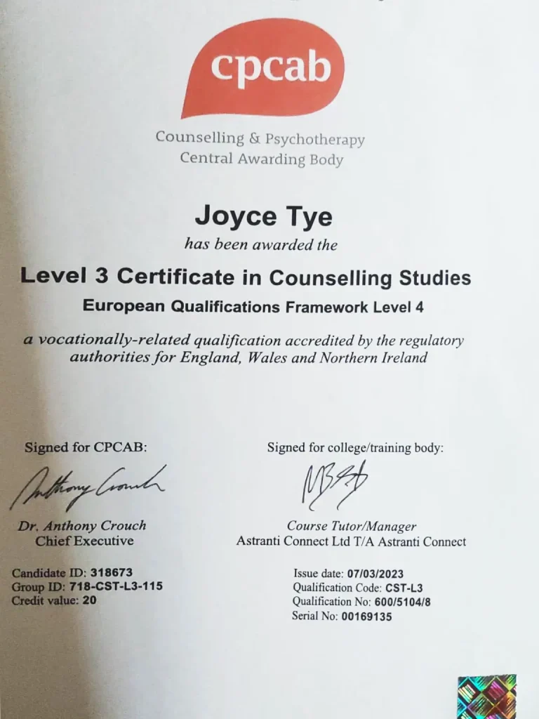 Joyce specialises in supporting adults (particularly those in the second half of life) who feel stuck, unhappy, or disconnected from their true selves. She believes no one is broken; rather, each person is seeking to realise their full potential.